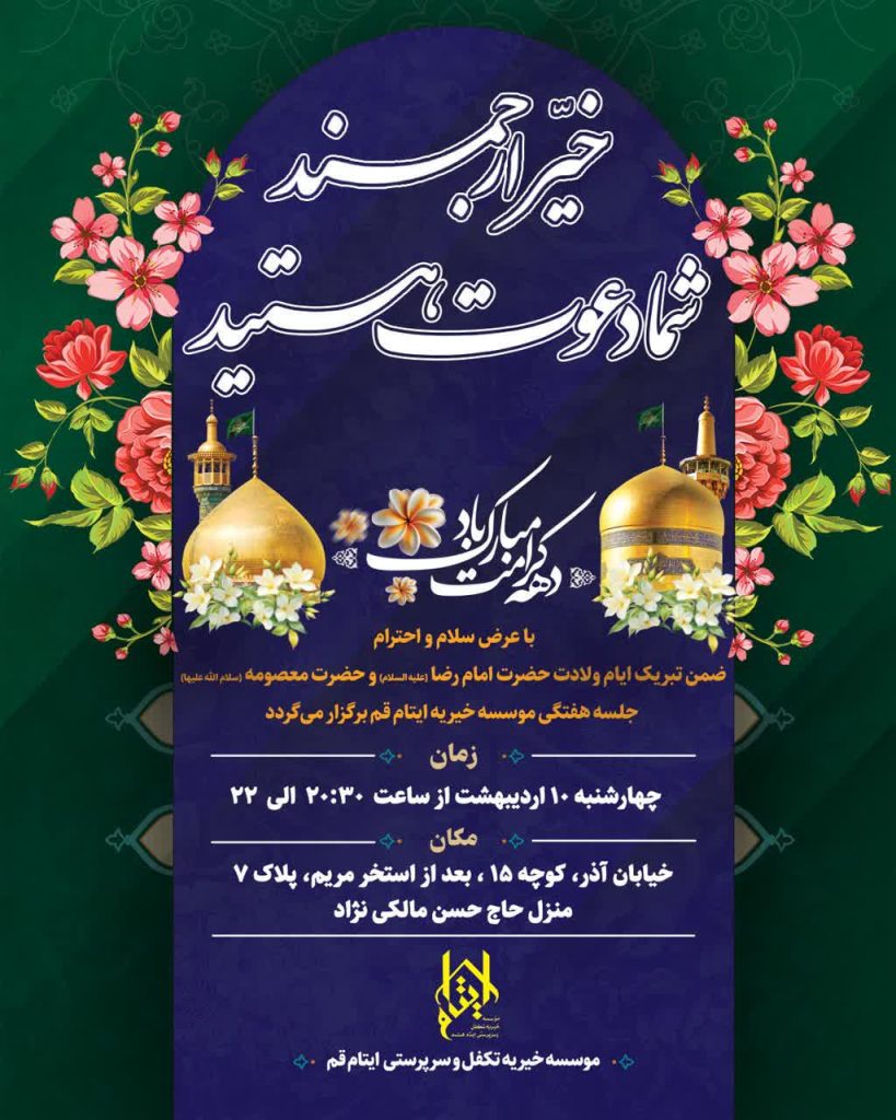 ششمین جلسه هفتگی خیران موسسه انجمن ایتام قم همزمان با دهه کرامت و شام میلاد با سعادت حضرت معصومه (س) چهارشنبه ۱۰ اردیبهشت ساعت ۲۰:۳۰ در منزل حاج حسن مالکی نژاد برگزار می گردد.